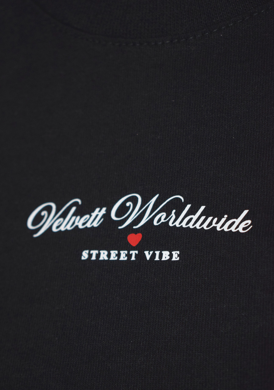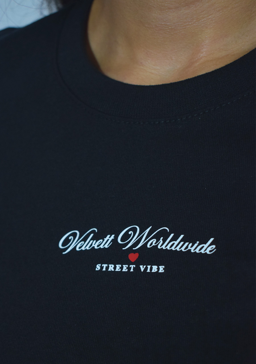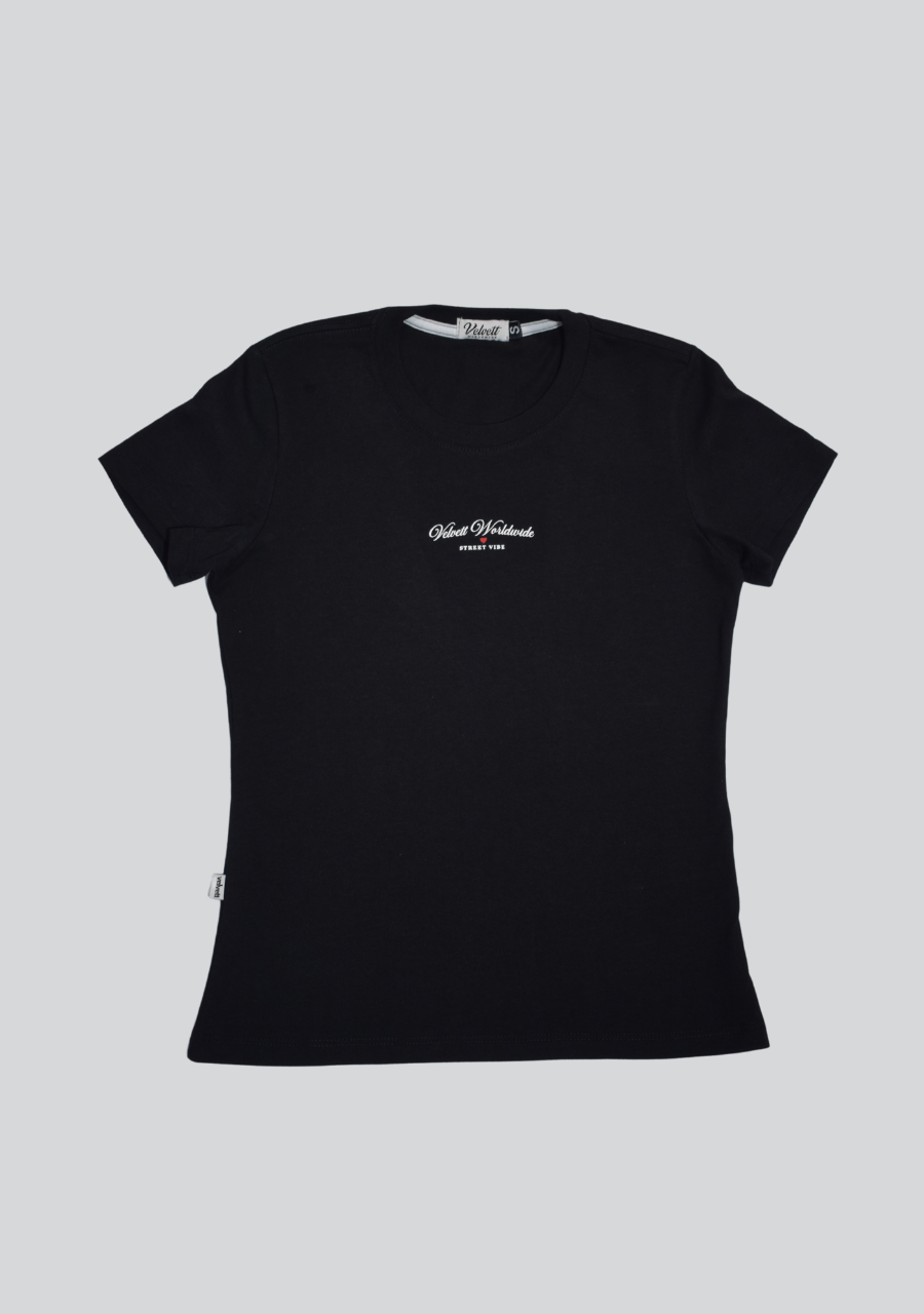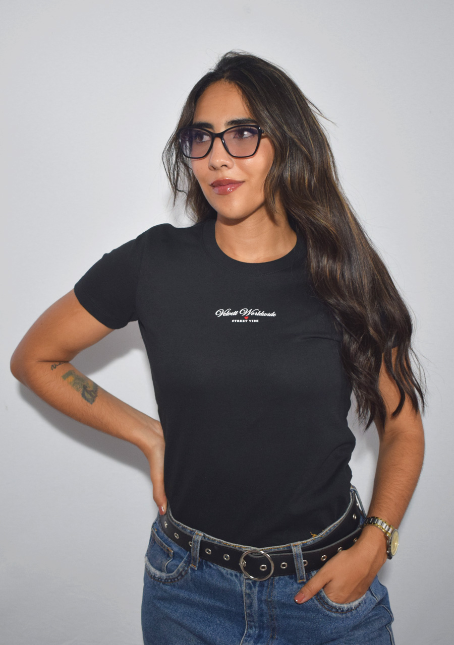 Camiseta básica negra con cuello en rib, confeccionada en algodón suave y transpirable. Su corte clásico y ajuste cómodo la hacen ideal para el uso diario. Tiene estampado en vinilo textil, con marquilla en cuello y costado derecho.