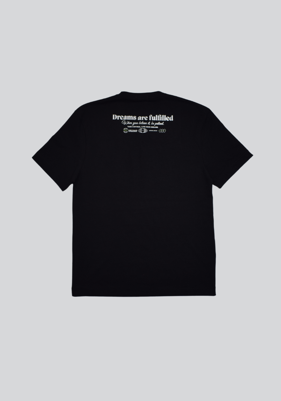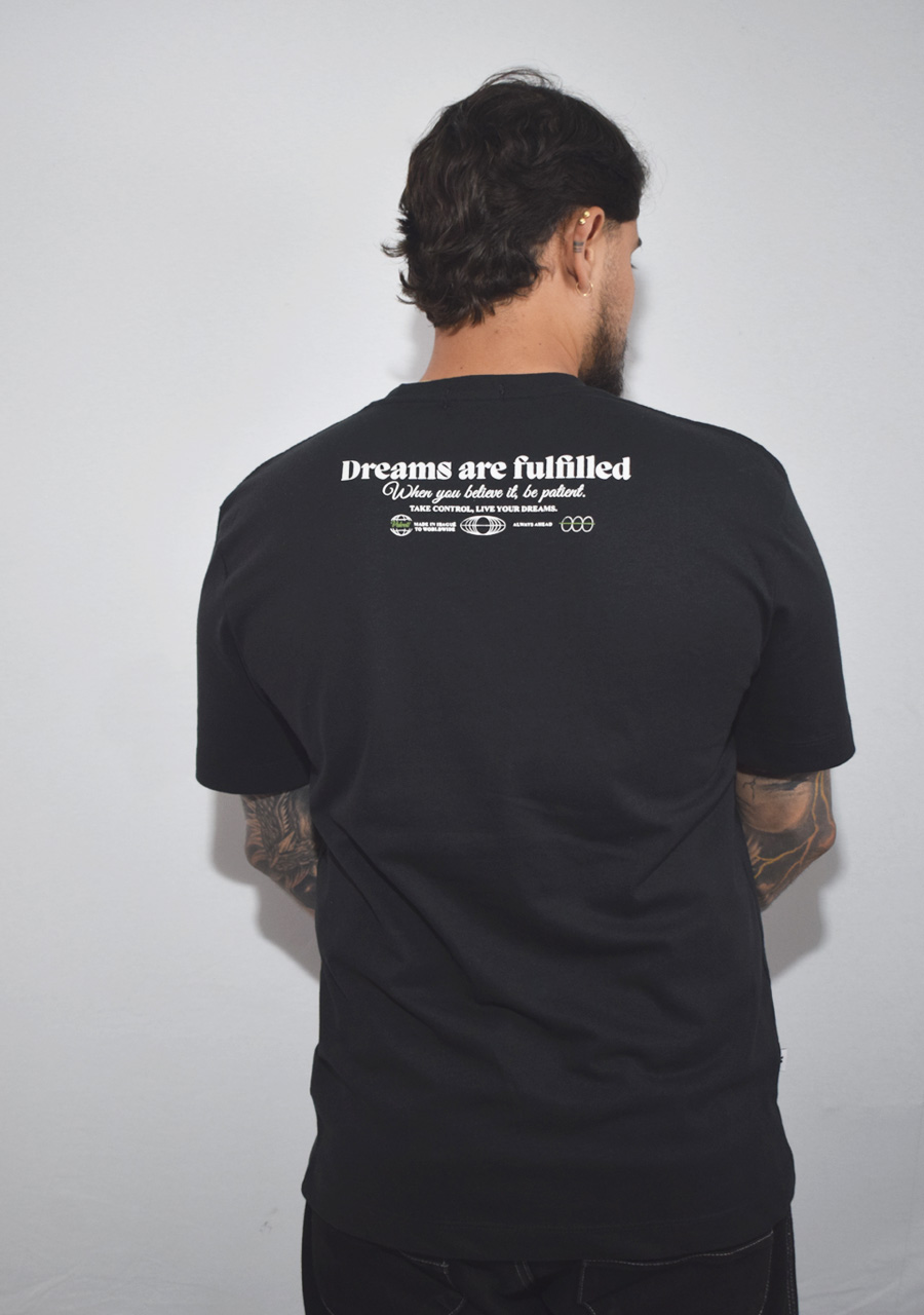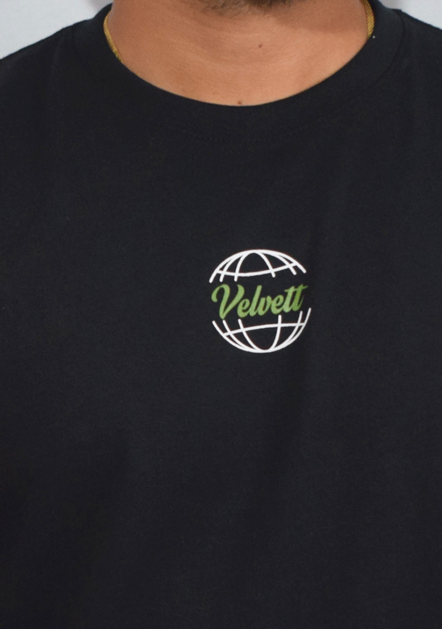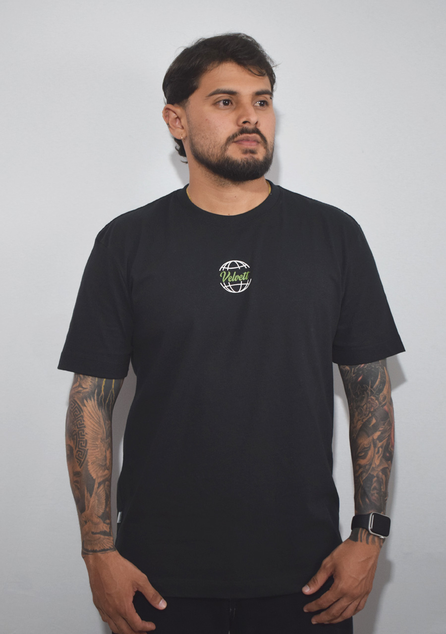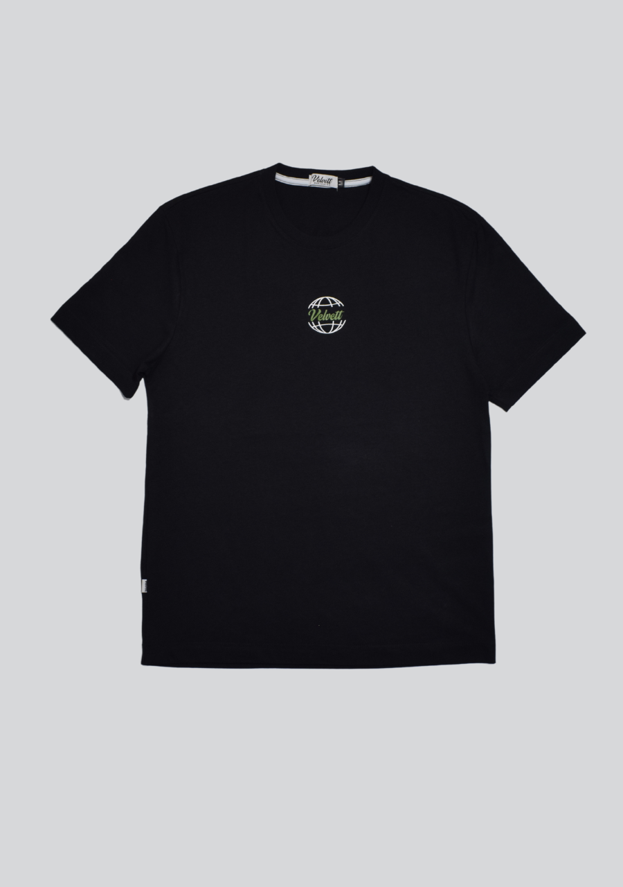 Camiseta regular negra de hombre con cuello en rib, elaborada en algodón suave y resistente. Su diseño clásico y ajuste cómodo la convierten en una prenda esencial para el uso diario. Tiene estampado adelante y atrás, con marquilla en cuello y costado derecho.