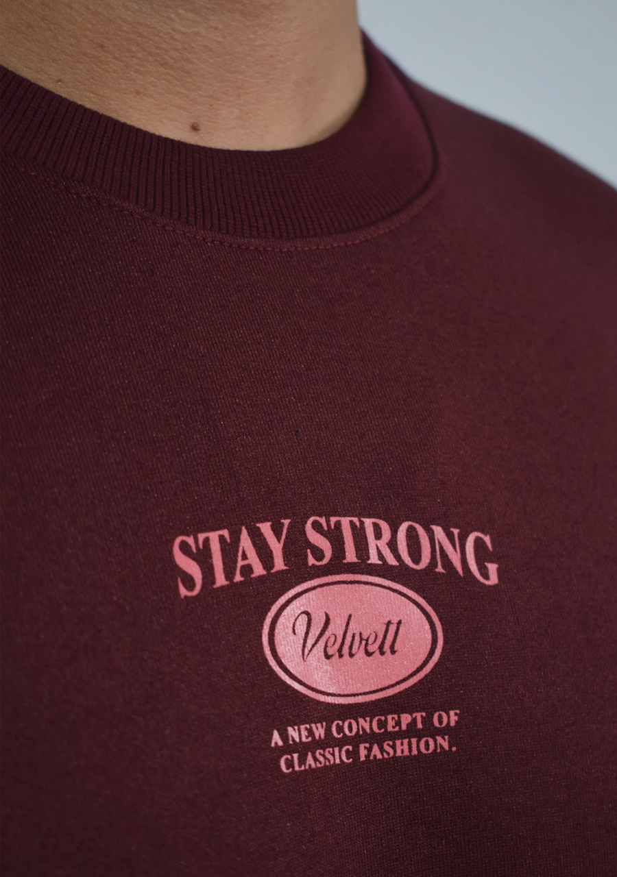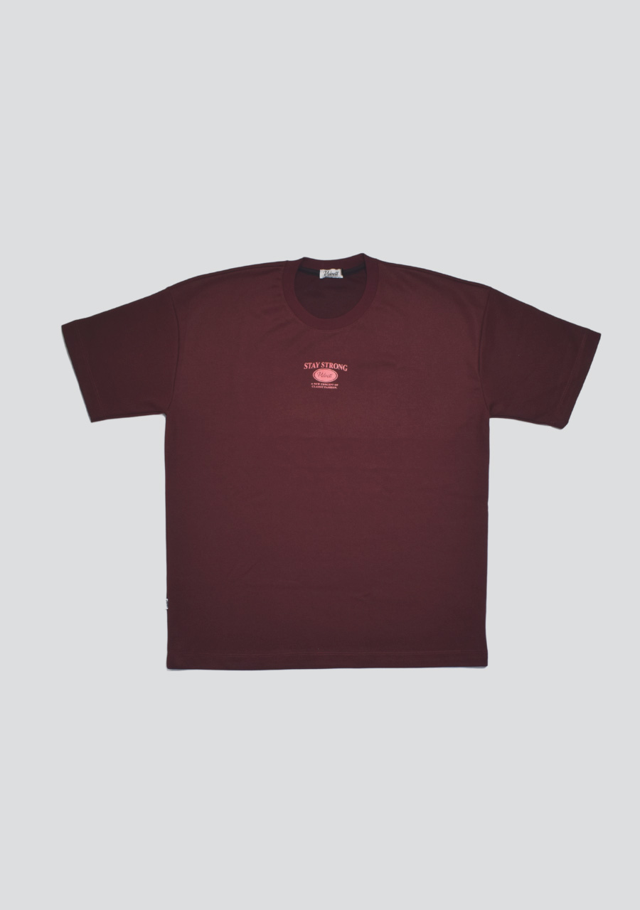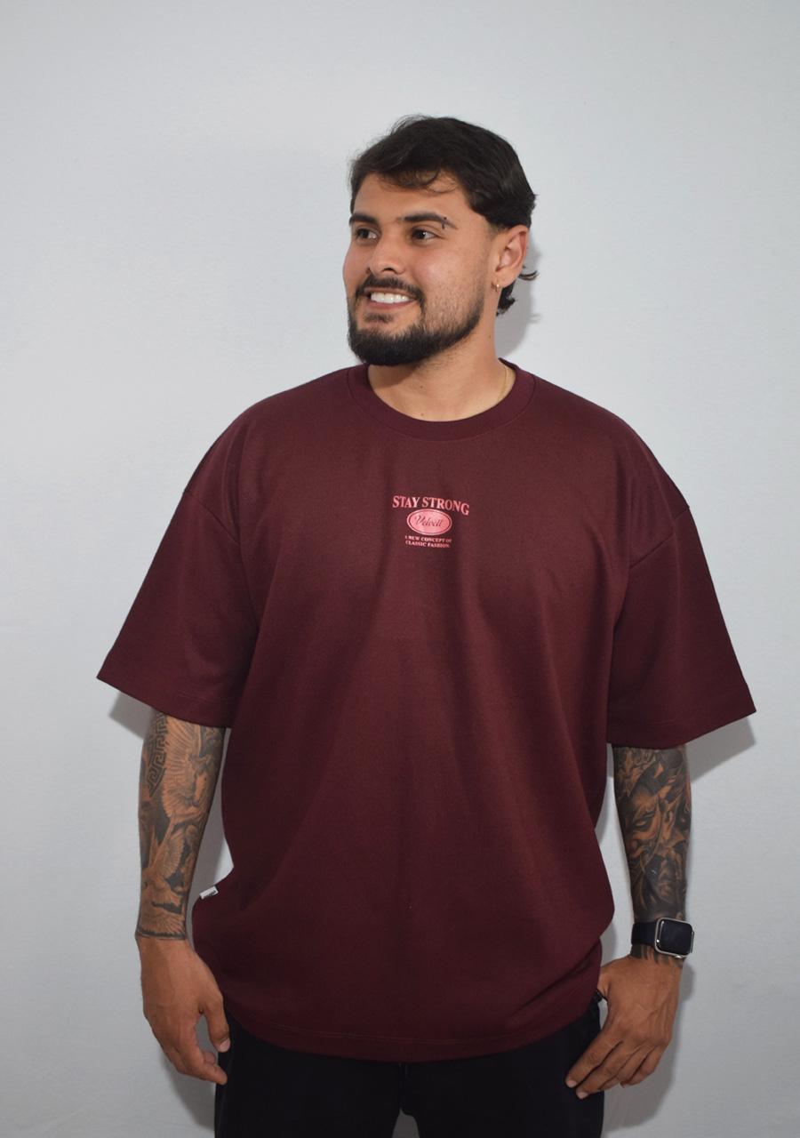 Camiseta oversize vinotinto de hombre con cuello en rib, confeccionada en algodón suave y resistente. Su corte amplio ofrece un estilo moderno y relajado, ideal para looks urbanos y casuales, con estampado en delantero y marquilla en cuello y costado derecho.